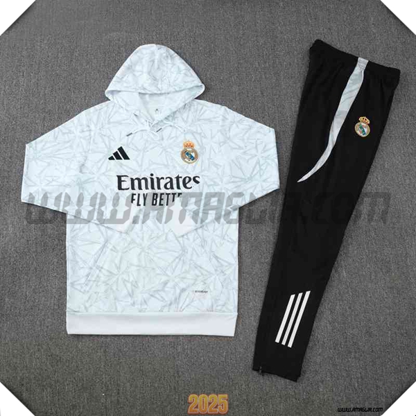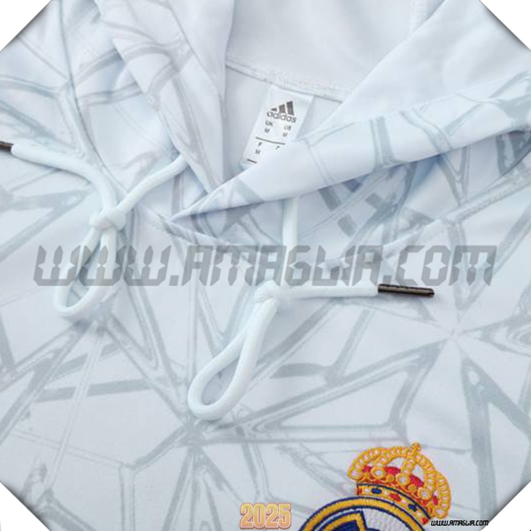 Nuova Giacca Con Cappuccio Tuta Real Madrid Bianco/Grigio 2025/2026. sito affidabile per l'acquisto tute squadre calcio a poco prezzo